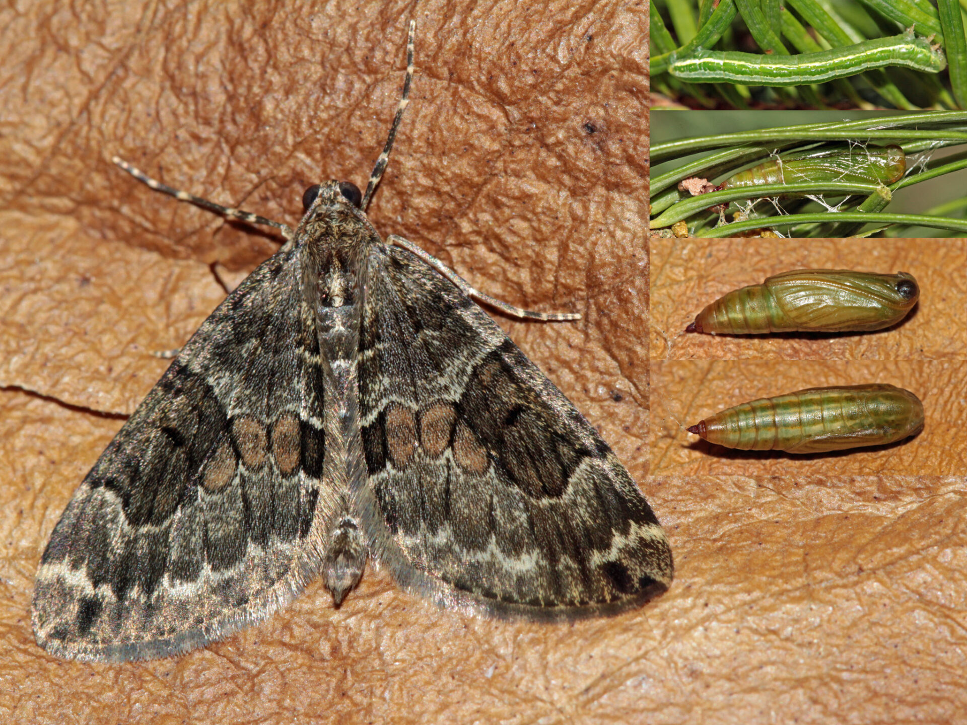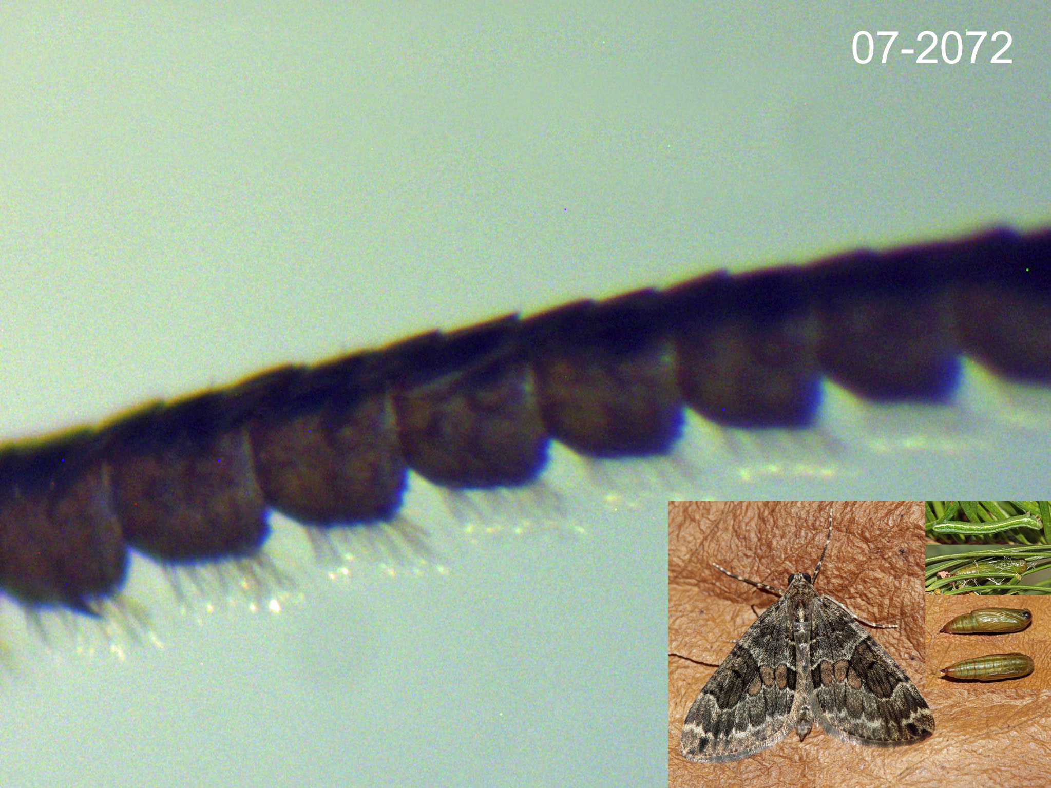 (5610/444639) GEOMETRIDAE, Larentiinae, Cidariini, Thera britannica (Turner, 1925) chenille de la Corythée anglaise ; hippodrome de Seiches-sur-le-Loir le 2014-02-09 (chenilles 07-1992 trouvée sur sapin sp le 09/02, élevage le 28/02, chrysalide le 28/02, imagos les 15 et 17/03) ; ident : JPC antenne imago