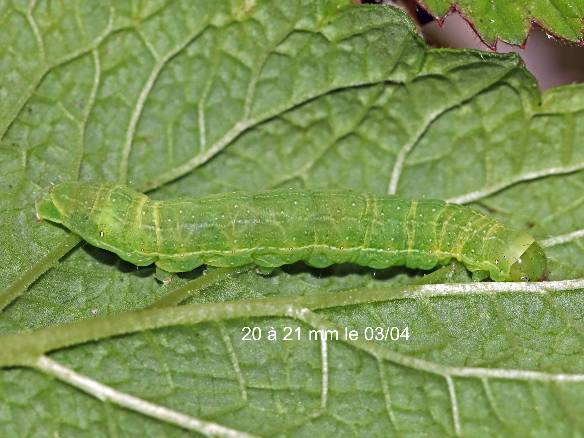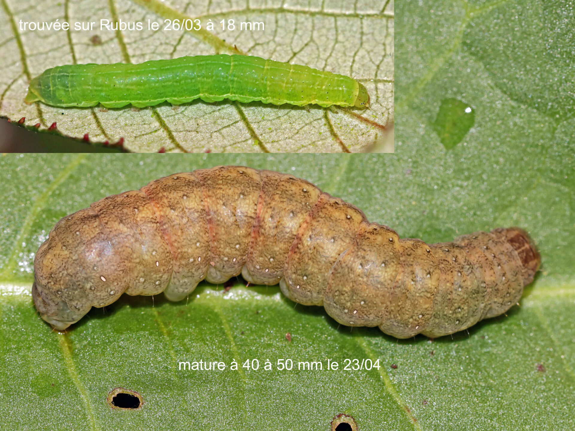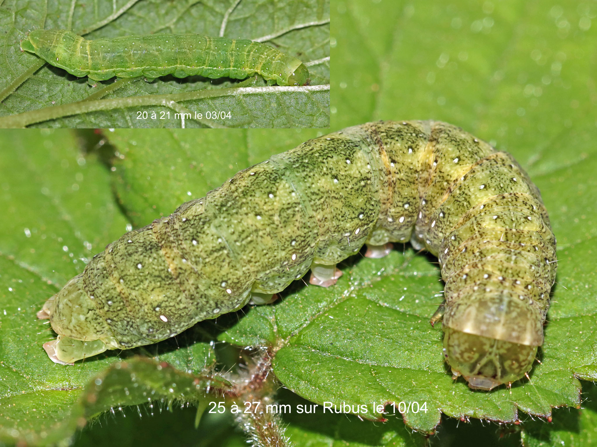 chenille 09-0917 trouvée sur Rubus à environ 18 mm le 26/03, 20 à 21 mm sur Melissa le 03/04, après sa mue le 10/04 à 25 à 27 mm, mature à 40 à 50 mm le 23/04, sous terre le 25/04, imago le 11/10