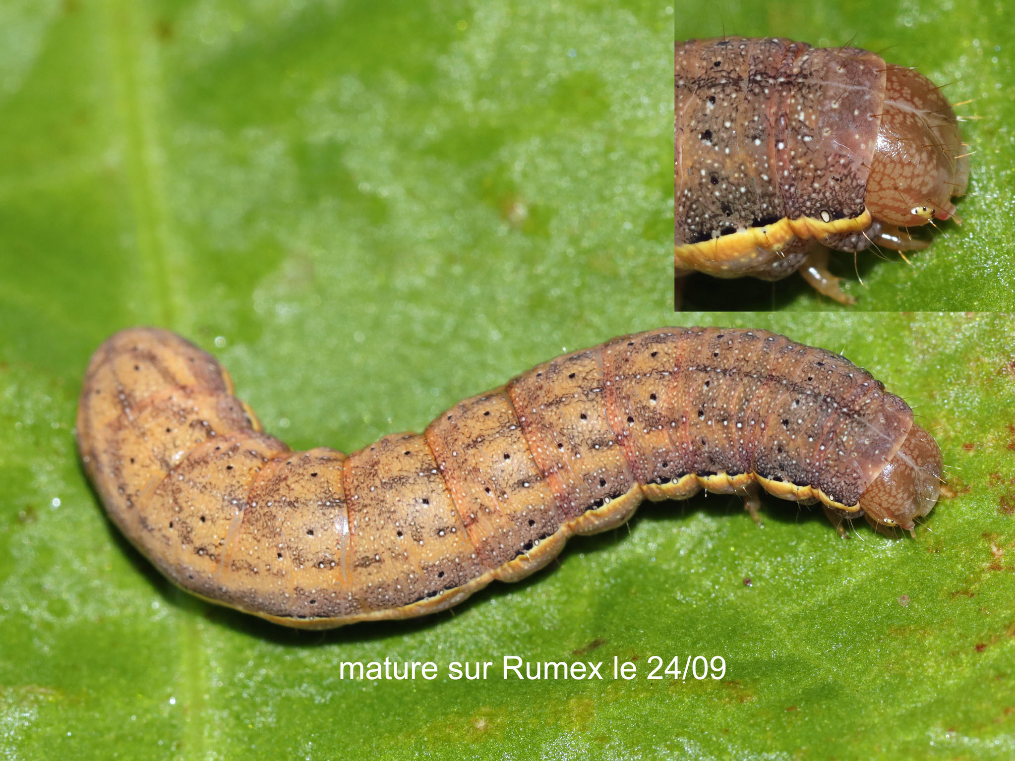 (6990/448262) NOCTUIDAE, Noctuinae, Hadenini, Lacanobia suasa (D & S, 1775) chenille de la Noctuelle enfumée, couleur de suie ; BVA d'Ecouflant le 2024-10-19 (chenille 09-0761 trouvée sur prairie mature à 33 à 35 mm Rumex ou Atriplex le 19/10/2024, imago le 09/04/2025) : ident : JPC