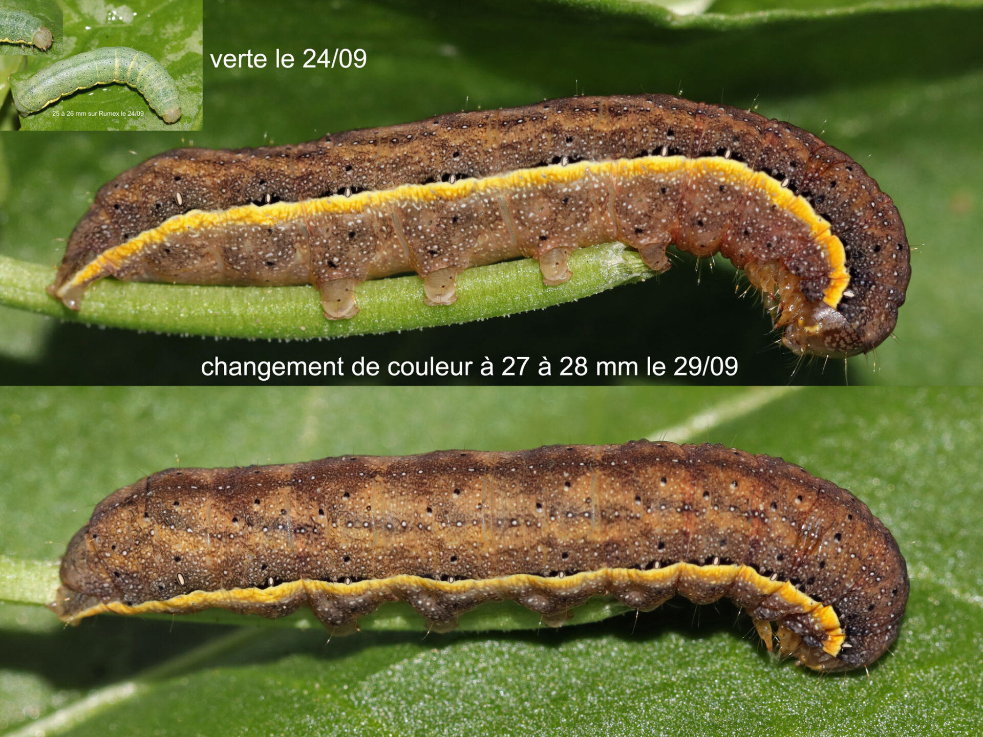 (6990/448262) NOCTUIDAE, Noctuinae, Hadenini, Lacanobia suasa (D & S, 1775) chenille de la Noctuelle enfumée, couleur de suie ; Soucelles, 49140 Rives-du-Loir-en-Anjou le 2025-09-24 (chenille 09-1606 trouvée à 25 à 26 mm sur Rumex, changement de couleur à 27 à 28 mm le 29/09) ; ident : JPC