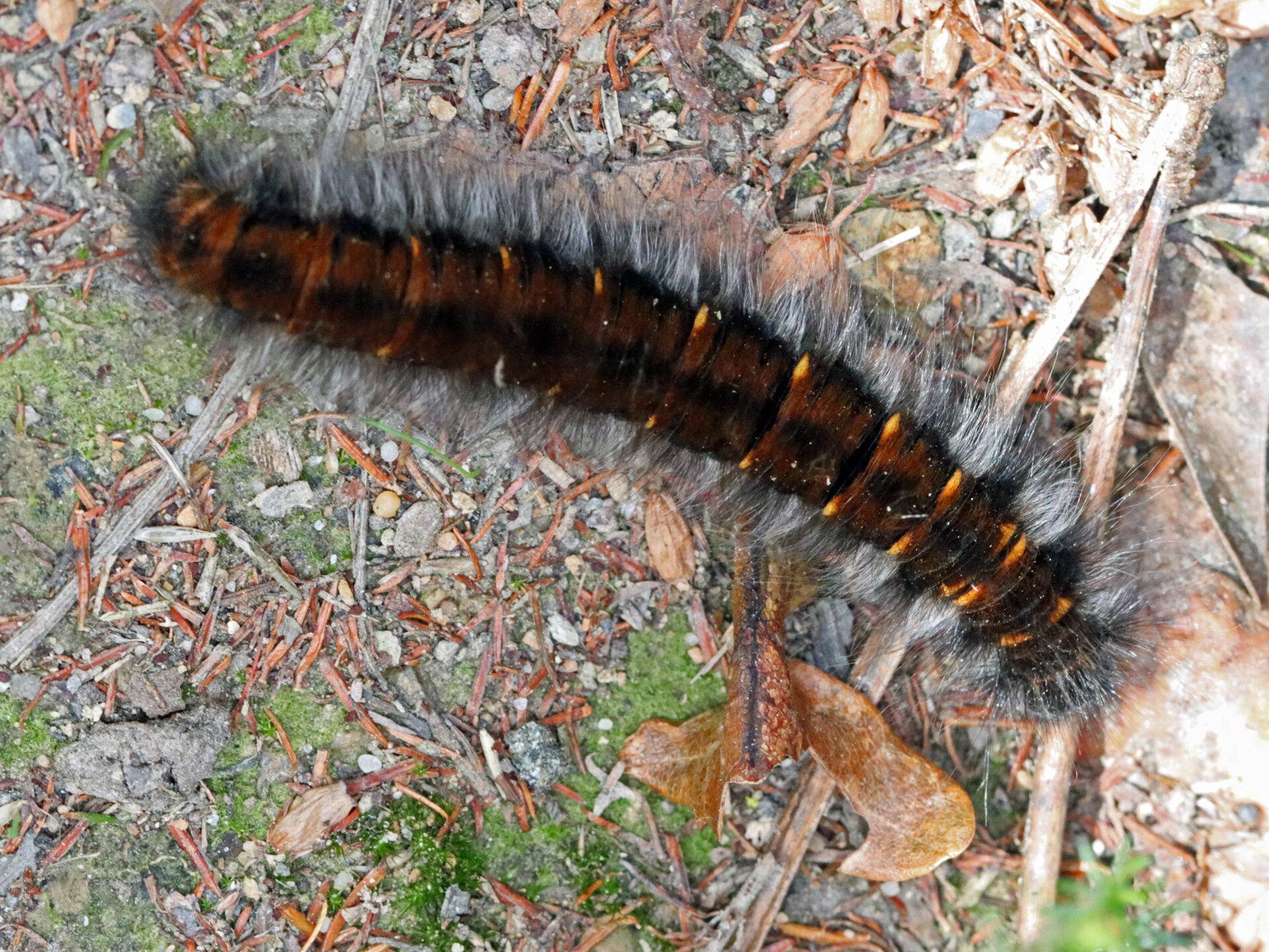 (5683/443557) LASIOCAMPIDAE, Lasiocampinae, Macrothylaciini, Macrothylacia rubi (Linnaeus, 1758) chenille Bombyx de la ronce ; forêt de Longuenée, la Membrolle-sur-Longuenée le 2024-10-13 (mature en balade nymphale) ; ident : JPC
