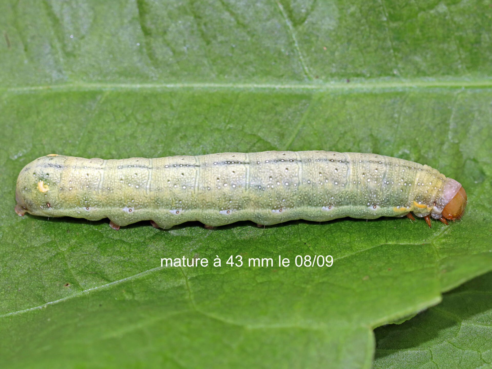 (6644/447344) NOCTUIDAE, Noctuinae, Dypterygiini, Trachea atriplicis (Linnaeus, 1758) chenille du Volant doré, la Noctuelle de l’Arroche sur Polygonum persicaria ; moulin de Charrenier, Mouliherne le 2013-08-29 (trouvée en mue à 12 mm sur Polygonum persicaria, la Renouée persicaire, 14 mm après sa mue le 31, 20 mm le 11/09) ; ident : JPC
